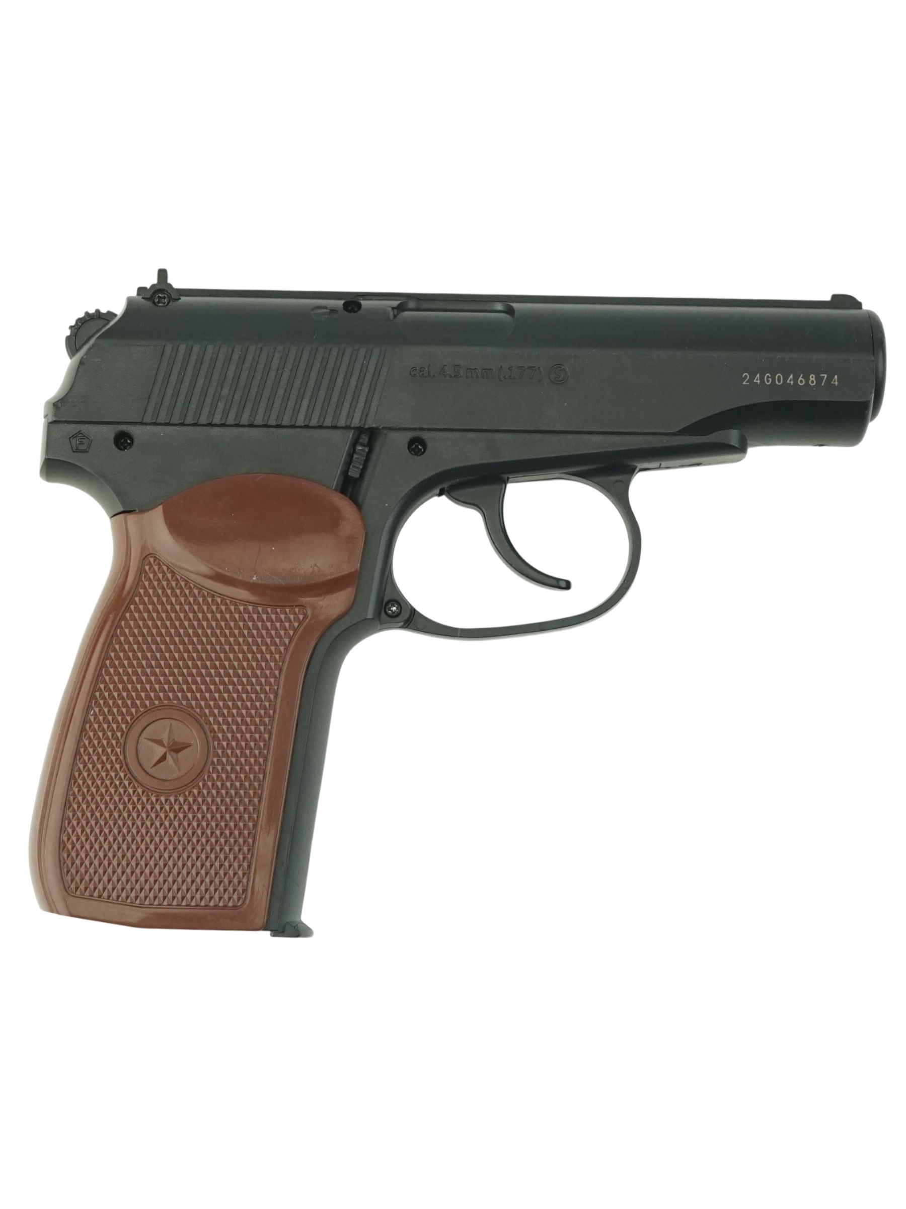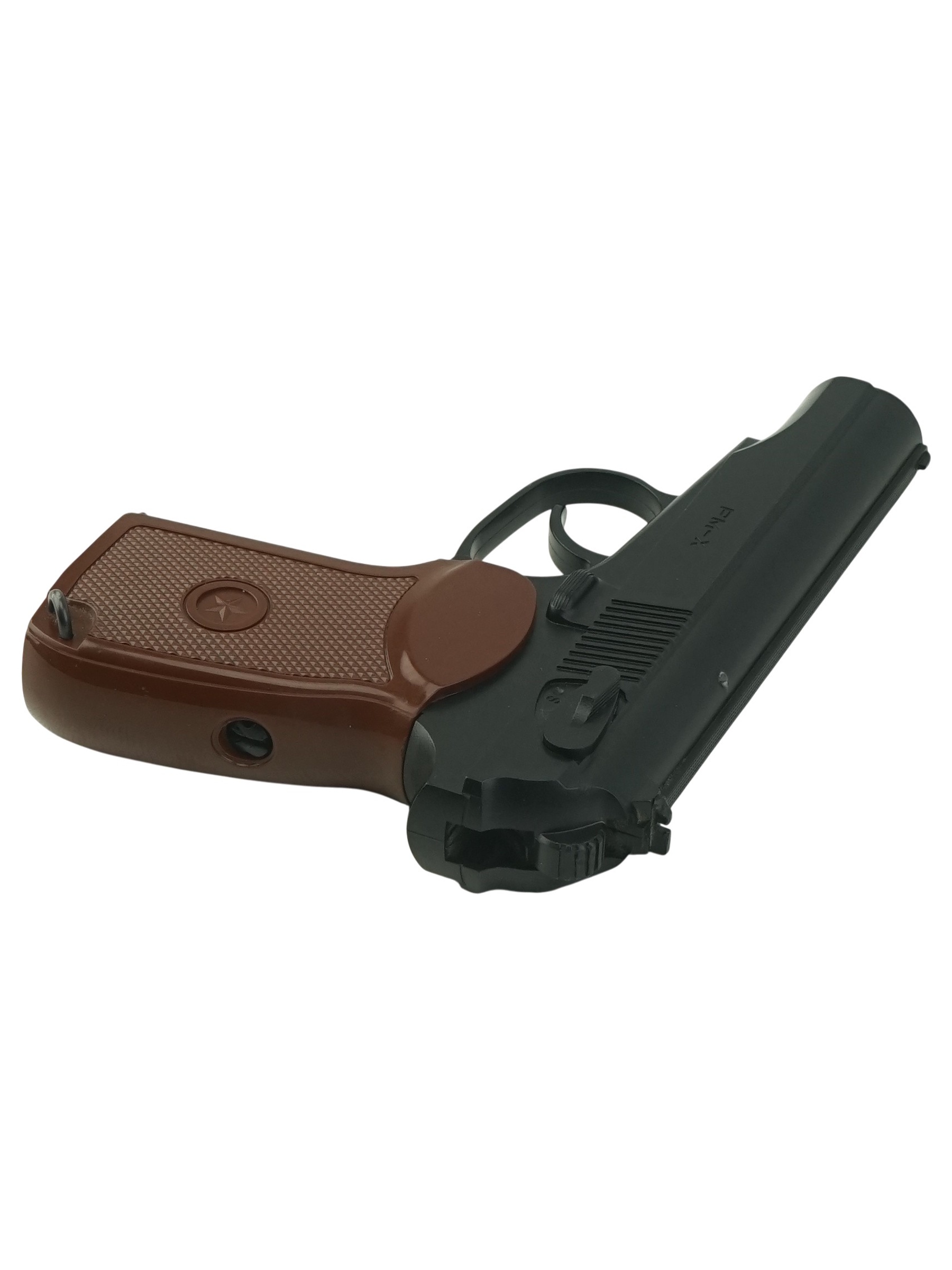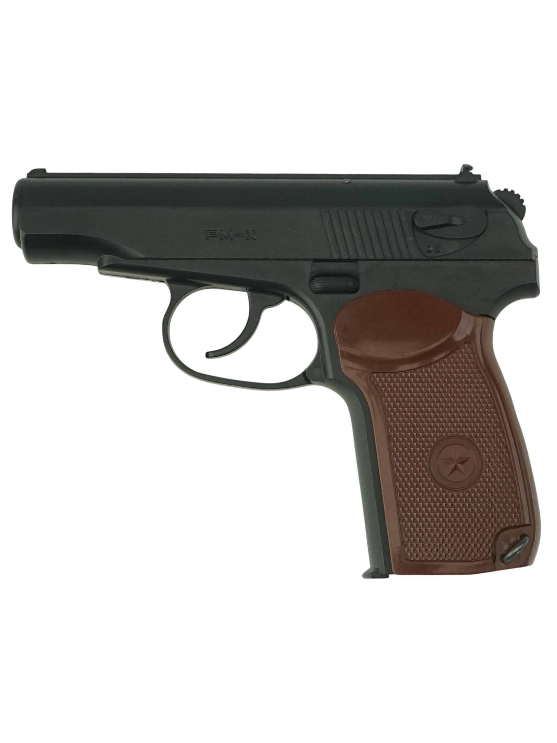 На вылете пуля набирает скорость до 125 м/с, при этом показатель дульной энергии пистолета Borner PM-X не превышает 3 Дж, поэтому приобрести его могут все желающие, без необходимости оформления разрешений и лицензий. Внешний вид пистолета также соответствует боевому прототипу в его классическом исполнении – корпус окрашен в черный цвет, на рукоятке пластиковая коричневая накладка с рифлением и пятиконечной звездой в центре.