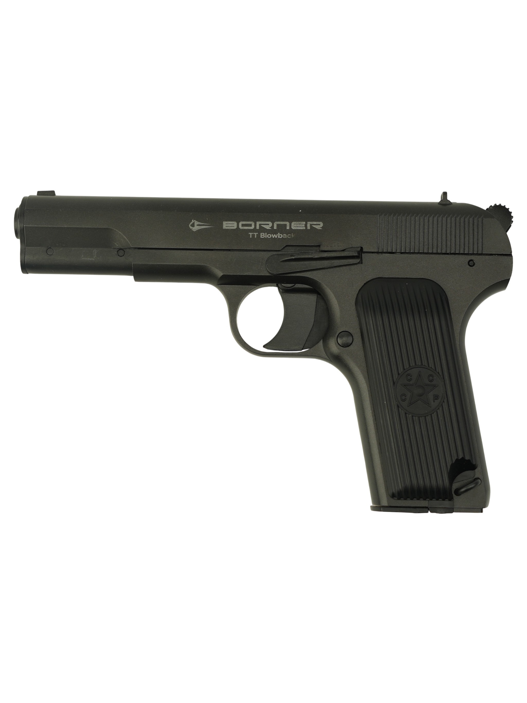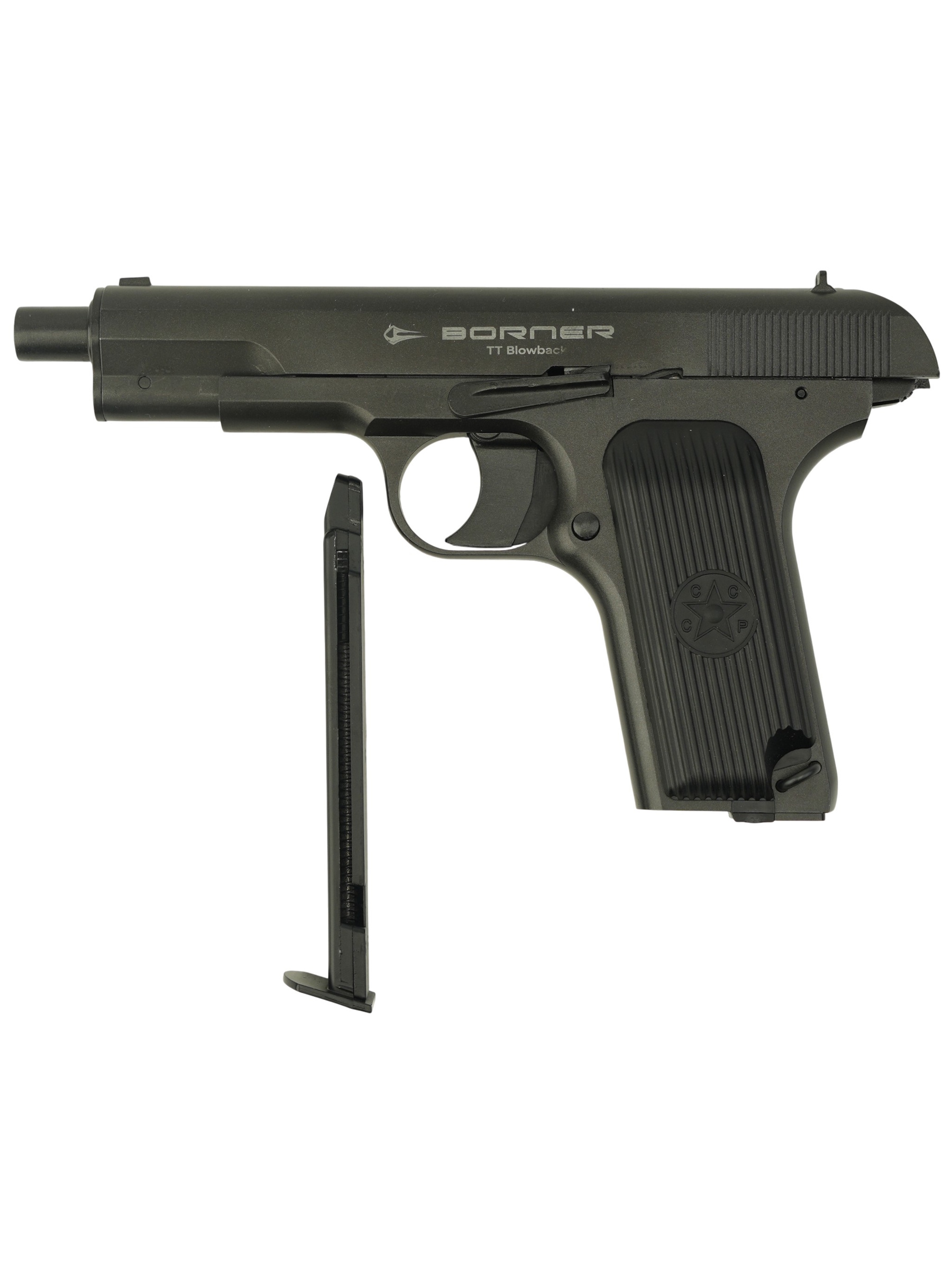 Пневматический пистолет Borner TT Blowback (Токарева) — это газобаллонная реплика непревзойденного ТТ, внешне полностью повторяющая боевой прототип. Выстрел из такого оружия возможен за счет использования энергии сжатого углекислого газа, которым заполнен баллончик весом 12 г. Место установки баллончика — отсек рукоятки.