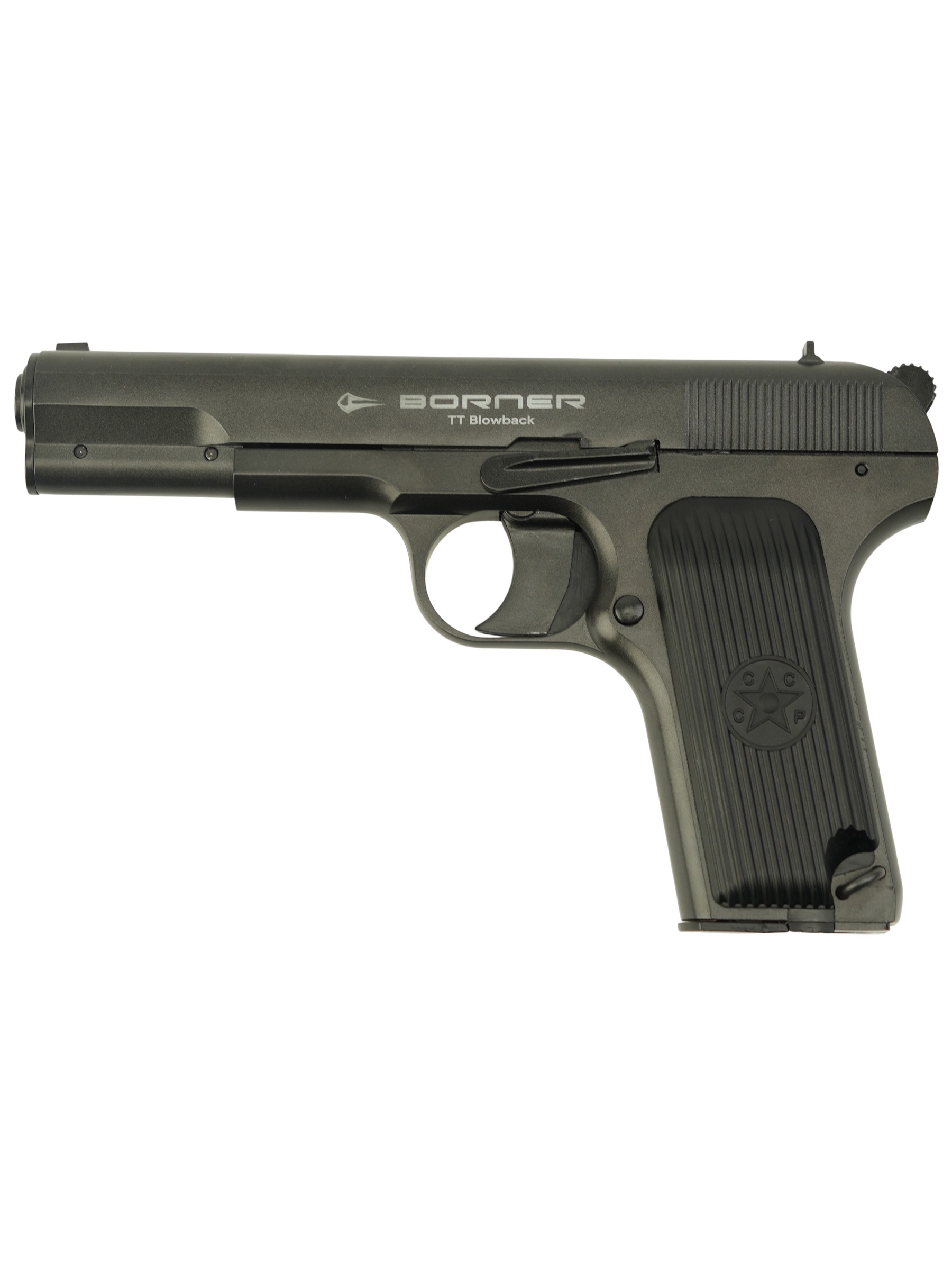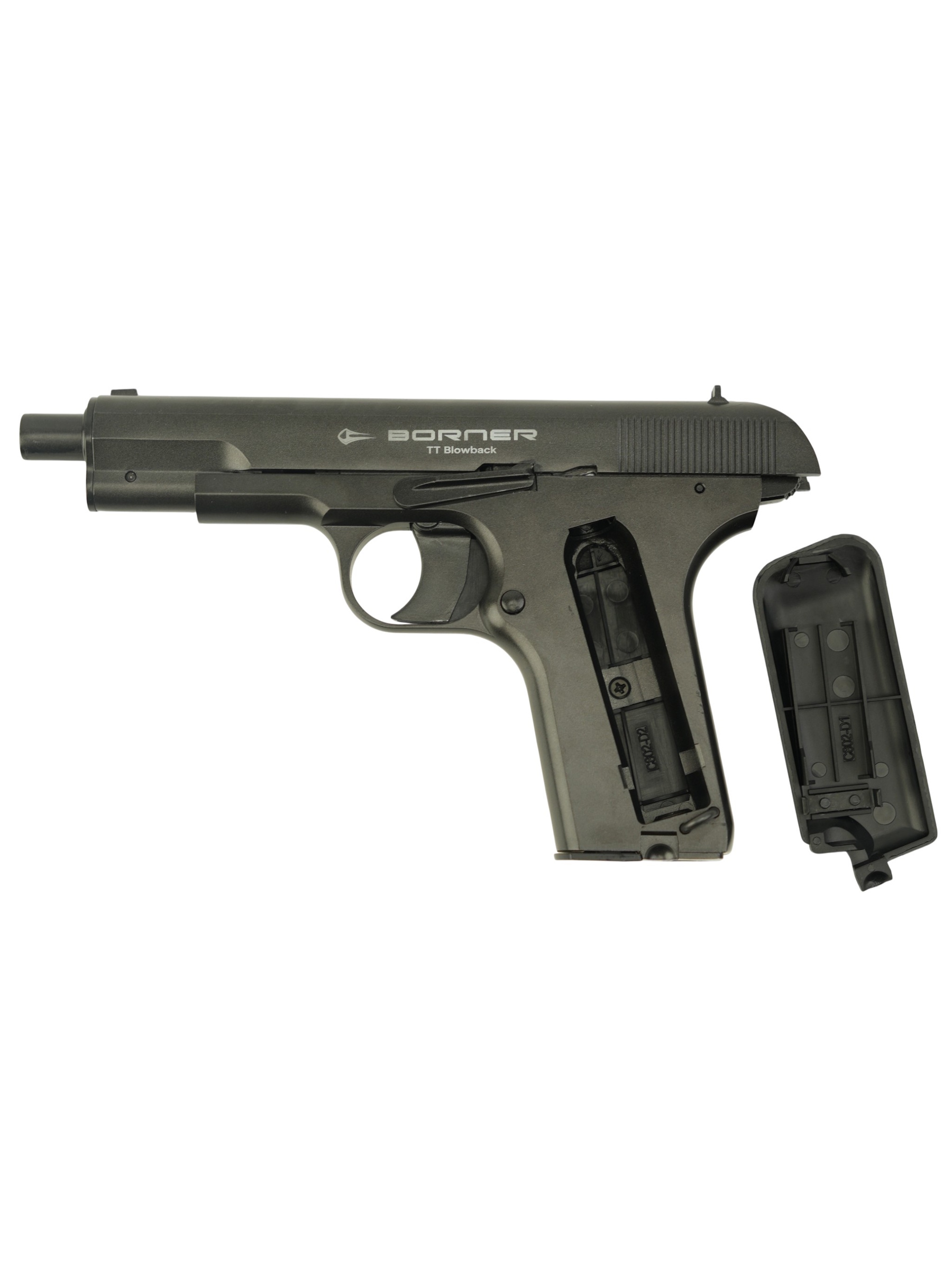 Пневматический пистолет Borner TT Blowback (Токарева) — это газобаллонная реплика непревзойденного ТТ, внешне полностью повторяющая боевой прототип. Выстрел из такого оружия возможен за счет использования энергии сжатого углекислого газа, которым заполнен баллончик весом 12 г. Место установки баллончика — отсек рукоятки.