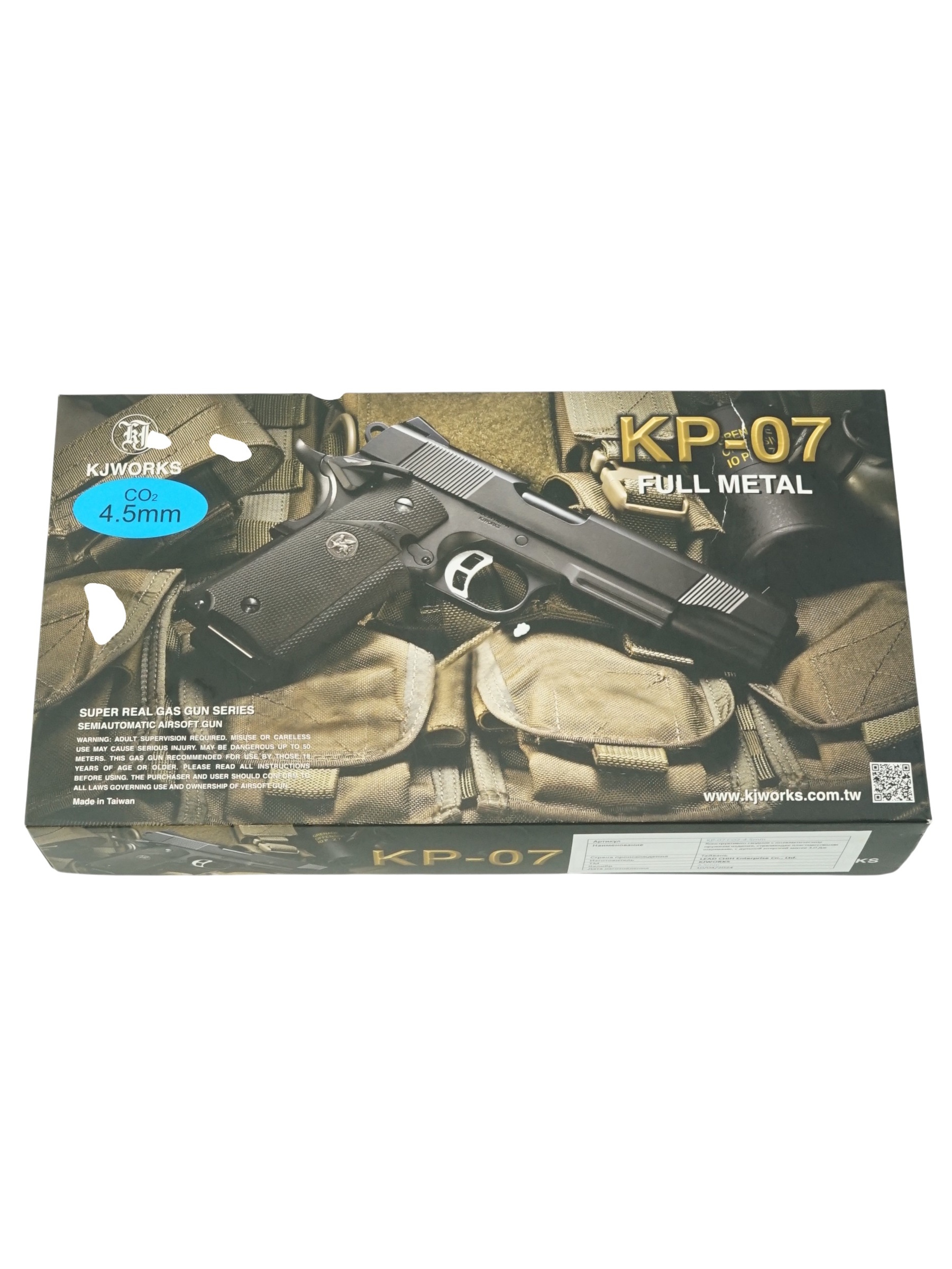Пневматический пистолет KJW KP-07 представляет собой пневматическую реплику калибра 4,5 мм, разработанную на основе американского пистолета M45 MEU(SOC), созданного для подразделений специального назначения США на базе Colt M1911A1. Реалистичность модели обеспечивается подвижным затвором с функцией блоубэка и затворной задержкой при отсутствии шариков.
