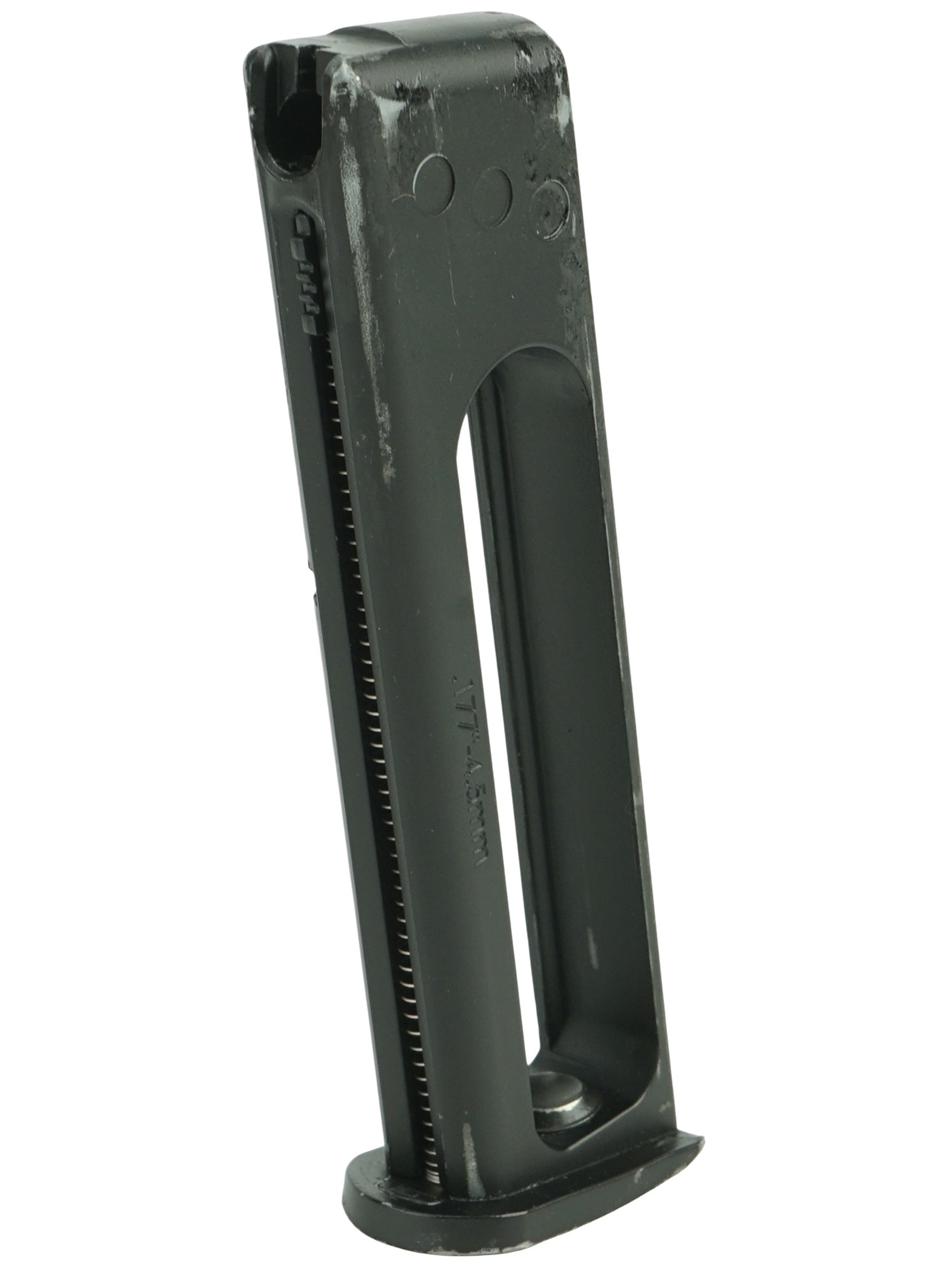 Магазин пистолета Смерш Н51 вмещает 17 стальных шариков. В него также устанавливается и баллон CO2. Поджимной винт здесь скрытого типа, благодаря чему снаружи рукоятки он вообще не торчит. Для вращения винта, прижима и прокола баллона применяется шестигранный ключ. В комплекте также поставляется упаковка на 250 шариков из стали, собственного производства Smersh. Стартовая скорость шарика модели Smersh H51 - 115 м/сек.