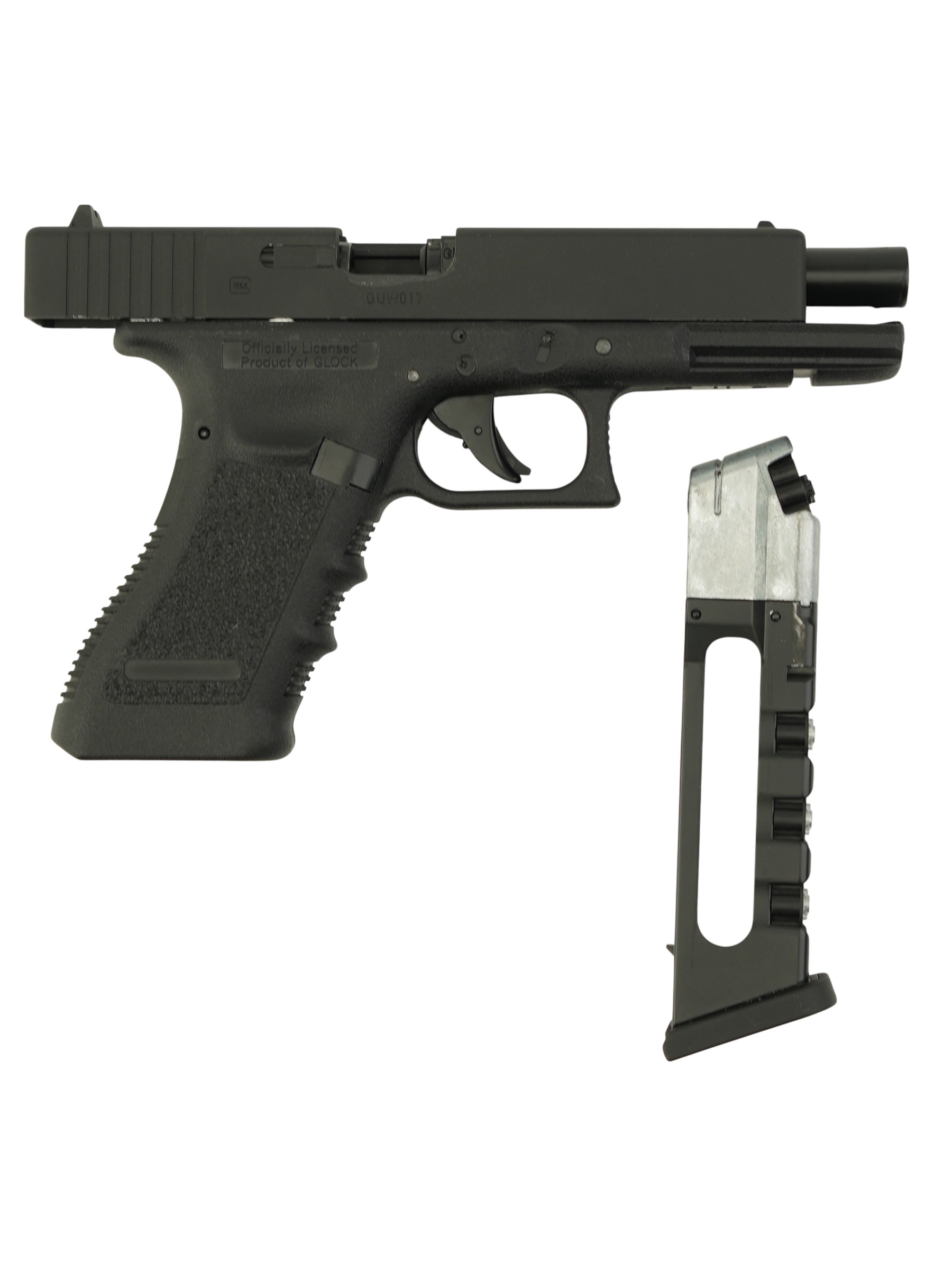Пневматический пистолет Umarex Glock 17 (blowback, BB/pellet) (5.8365) – это выпущенный по лицензии аналог известного боевого пистолета, красивое и качественное газобаллонное вооружение для развлечений и хардбола. Пистолет работает от энергии газа, заключенного в баллончик на 12 г, он установлен в отсек рукоятки.
