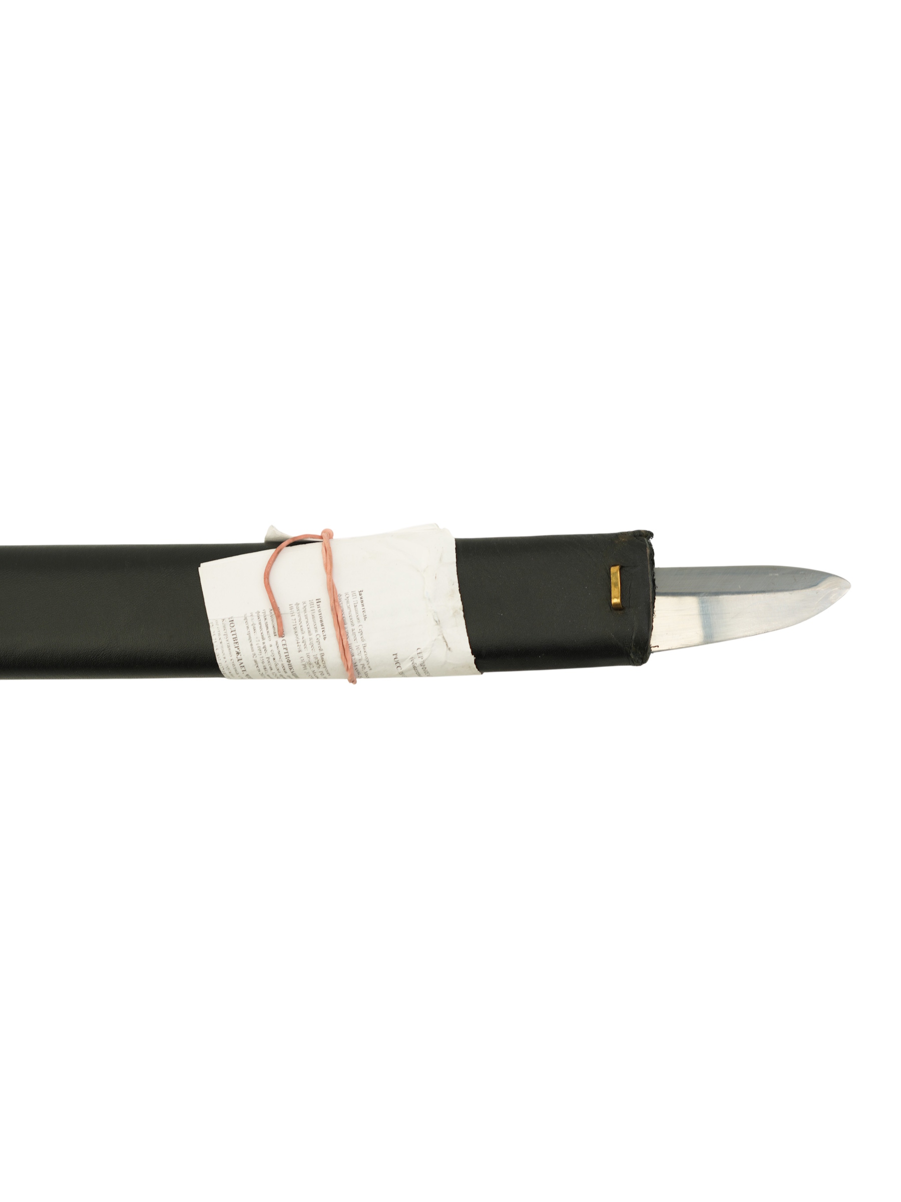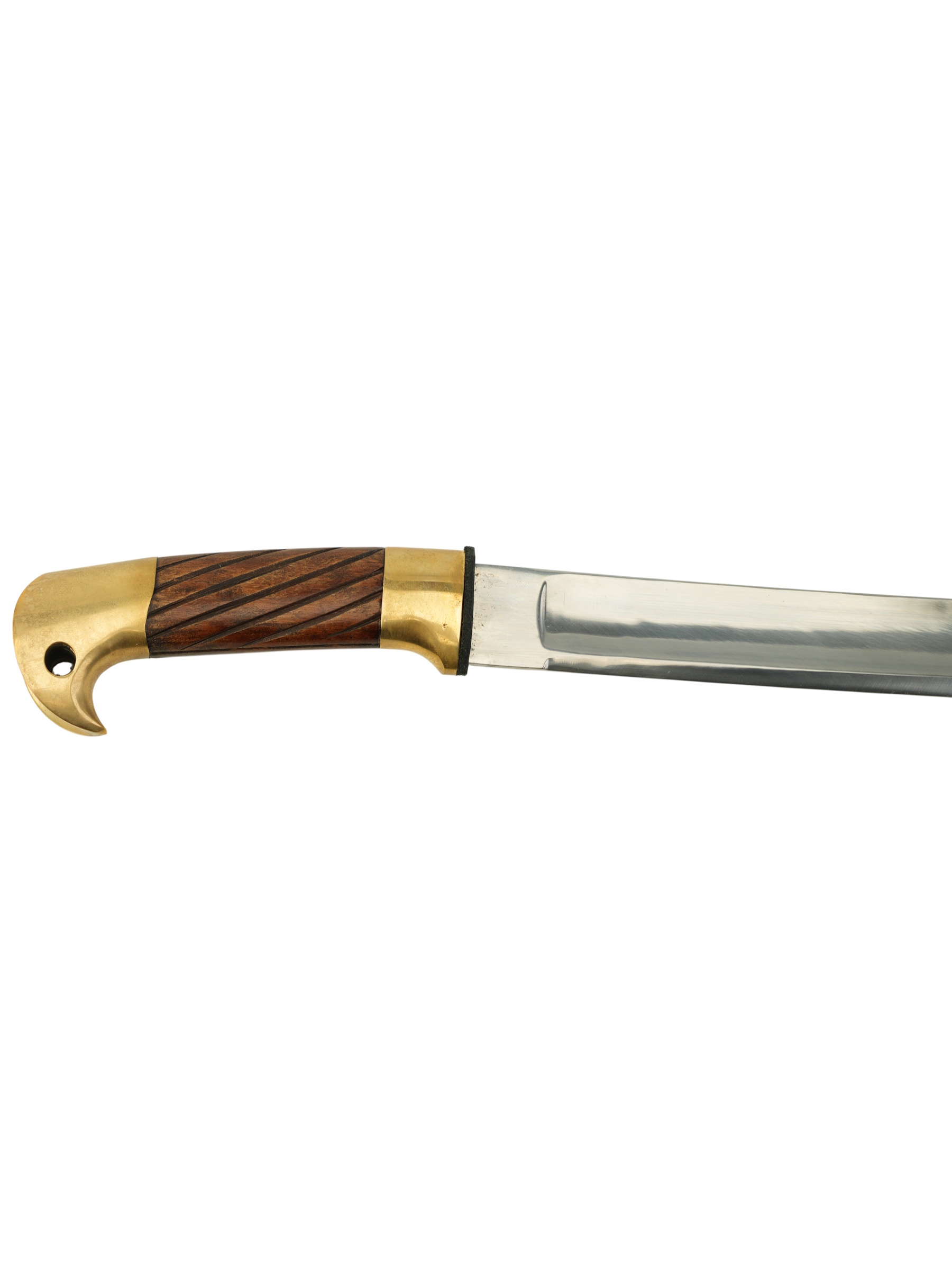 Шашка не заточена, но ее можно заточить самостоятельно, сталь высокого качества, долго держит заточку. Ножны изготовлены из дерева, латуни и натуральной кожи.