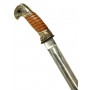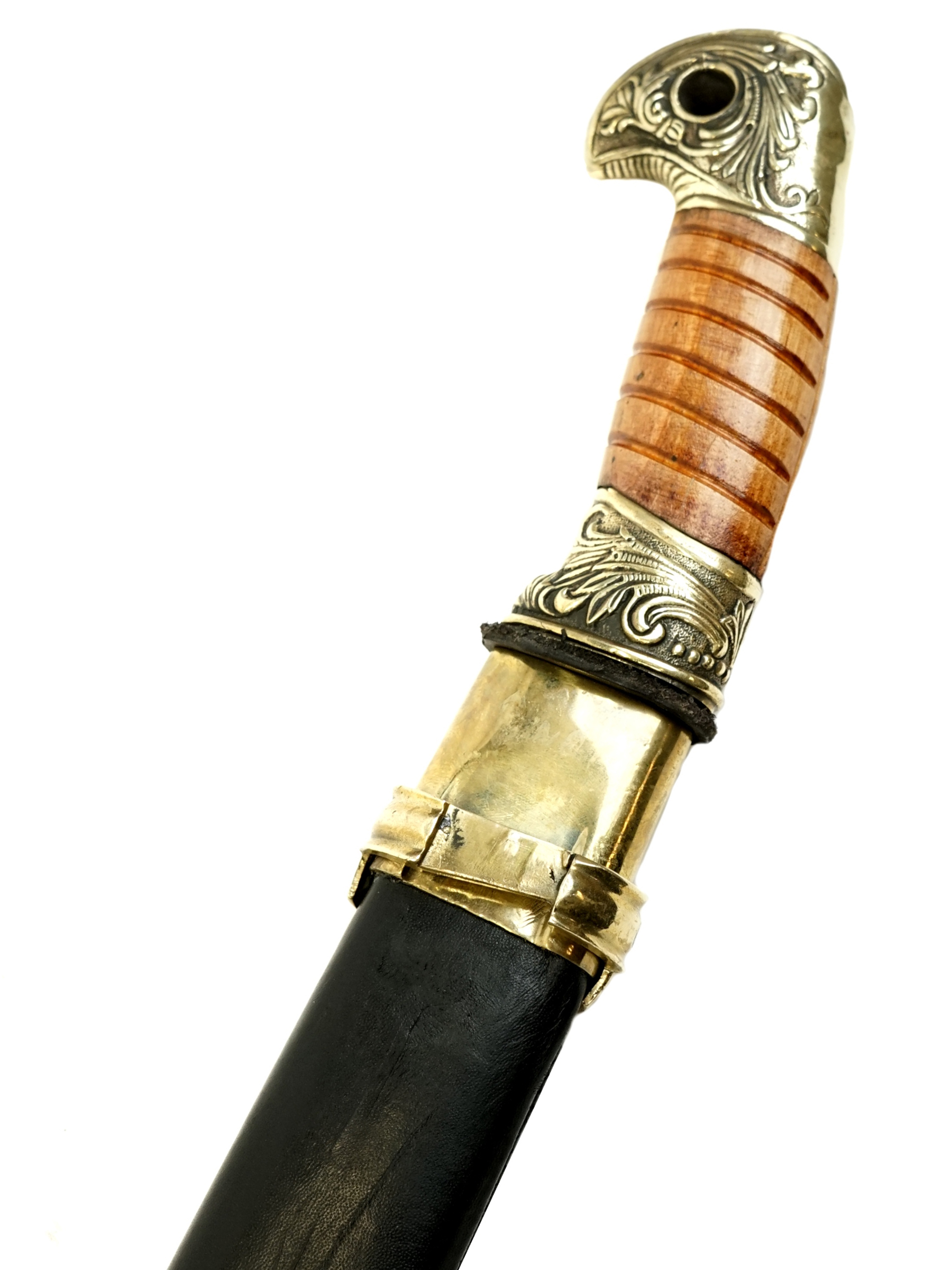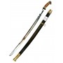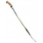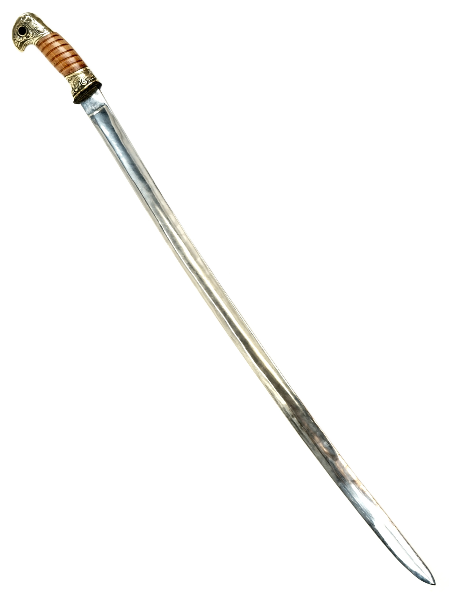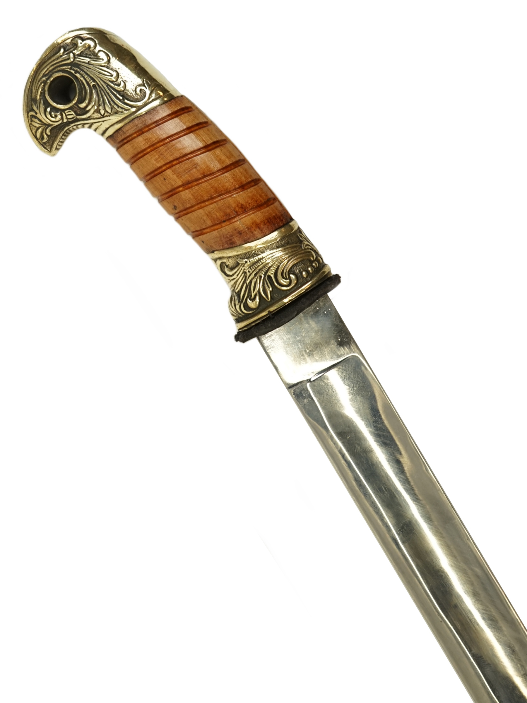 Шашка не заточена, но ее можно заточить самостоятельно, сталь высокого качества, долго держит заточку. Ножны изготовлены из дерева, латуни и натуральной кожи.