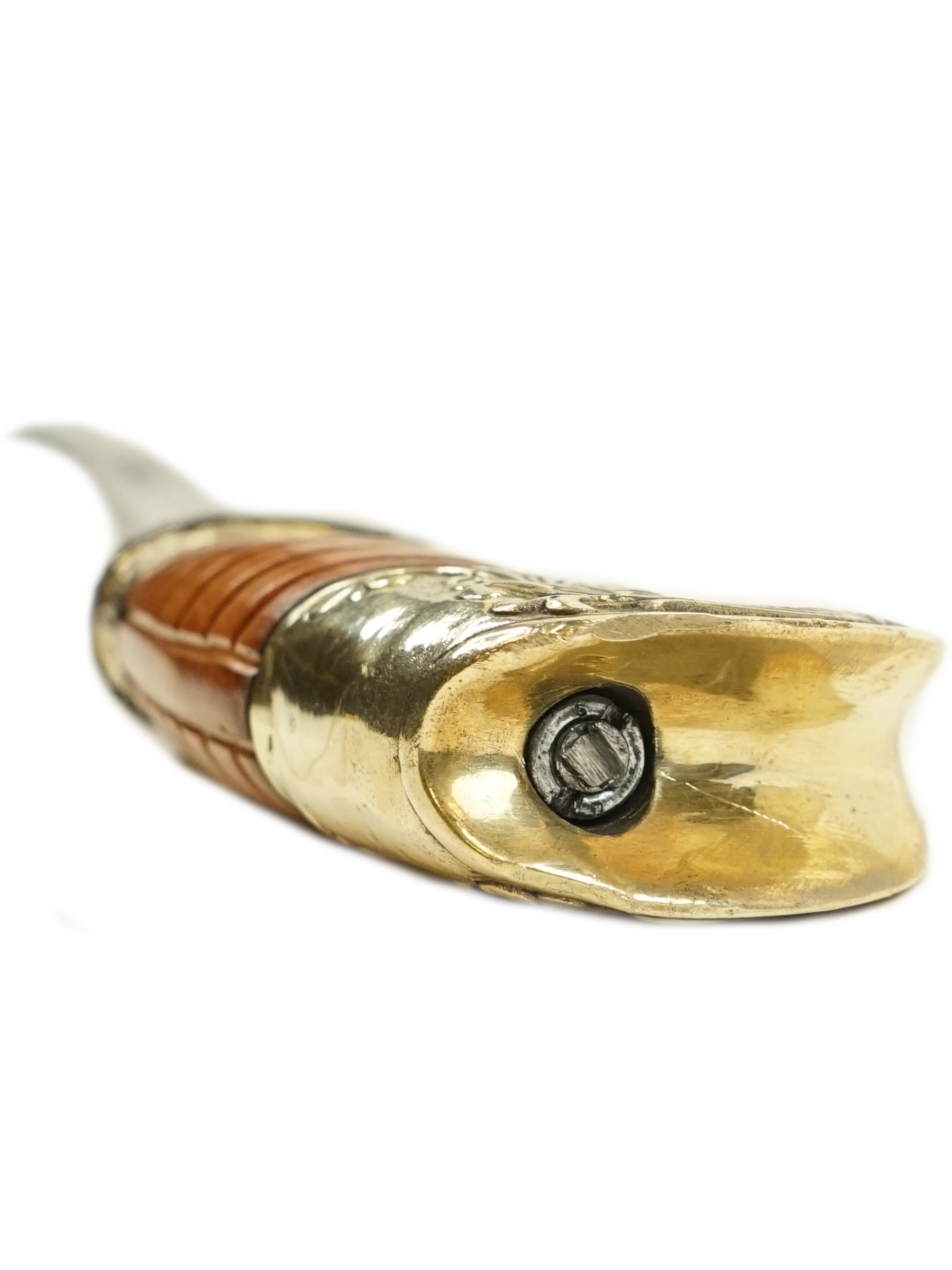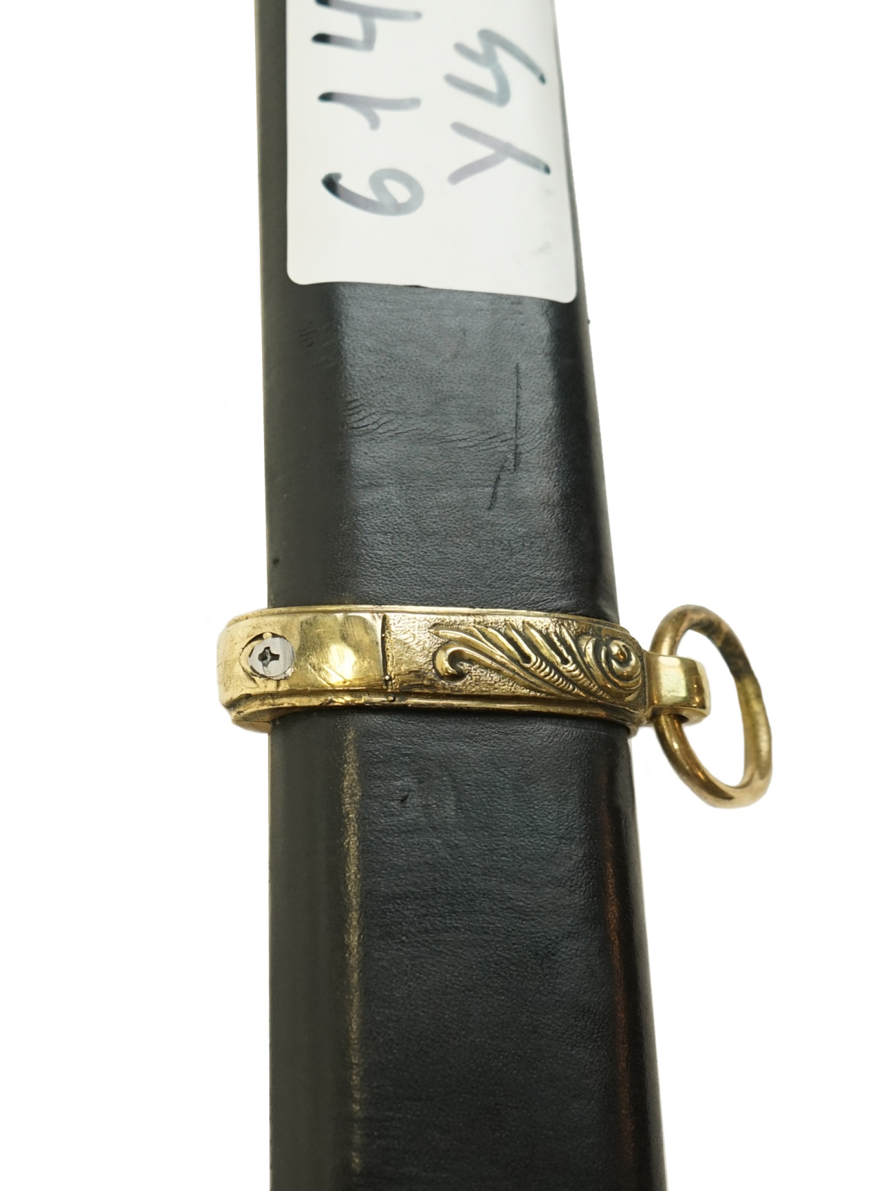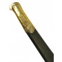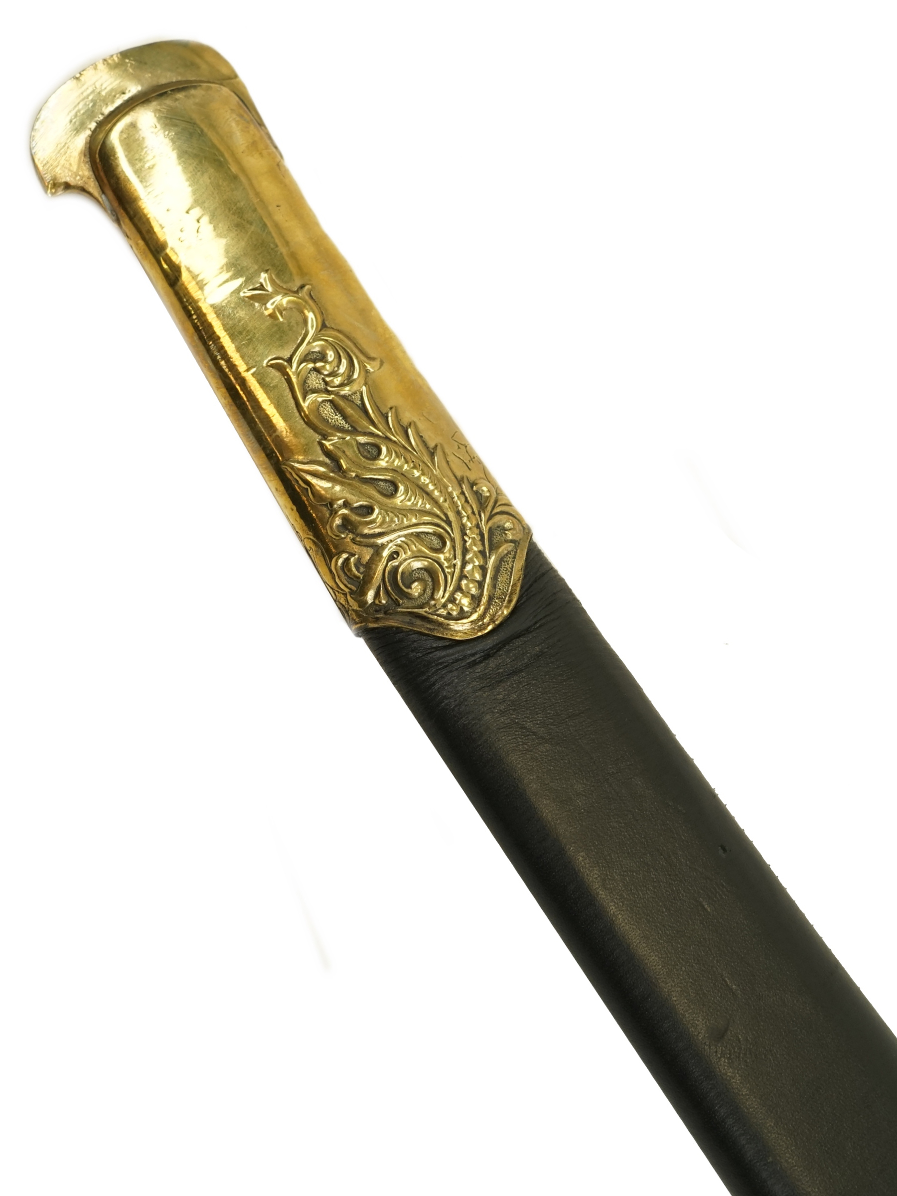 Деревянные ножны обтянуты кожей. Латунный прибор состоит из устья, гайки и наконечника. На устье с внутренней стороны имеется скоба, а на гайке кольцо.