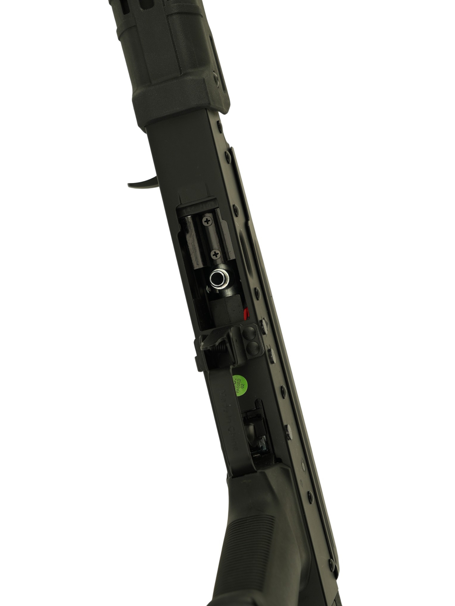 Работает привод от аккумулятора NiMH на 1200mAh, который поставляется в комплекте с автоматом. Место установки элемента питания – ствольная коробка. Установлен гирбокс версии 3, позволяющий заменить его комплектующие на усиленные детали других производителей. Хоп-ап регулируемый, обеспечит нужную силу подкрутки шариков, доступ к камере открывается после взведения затвора.