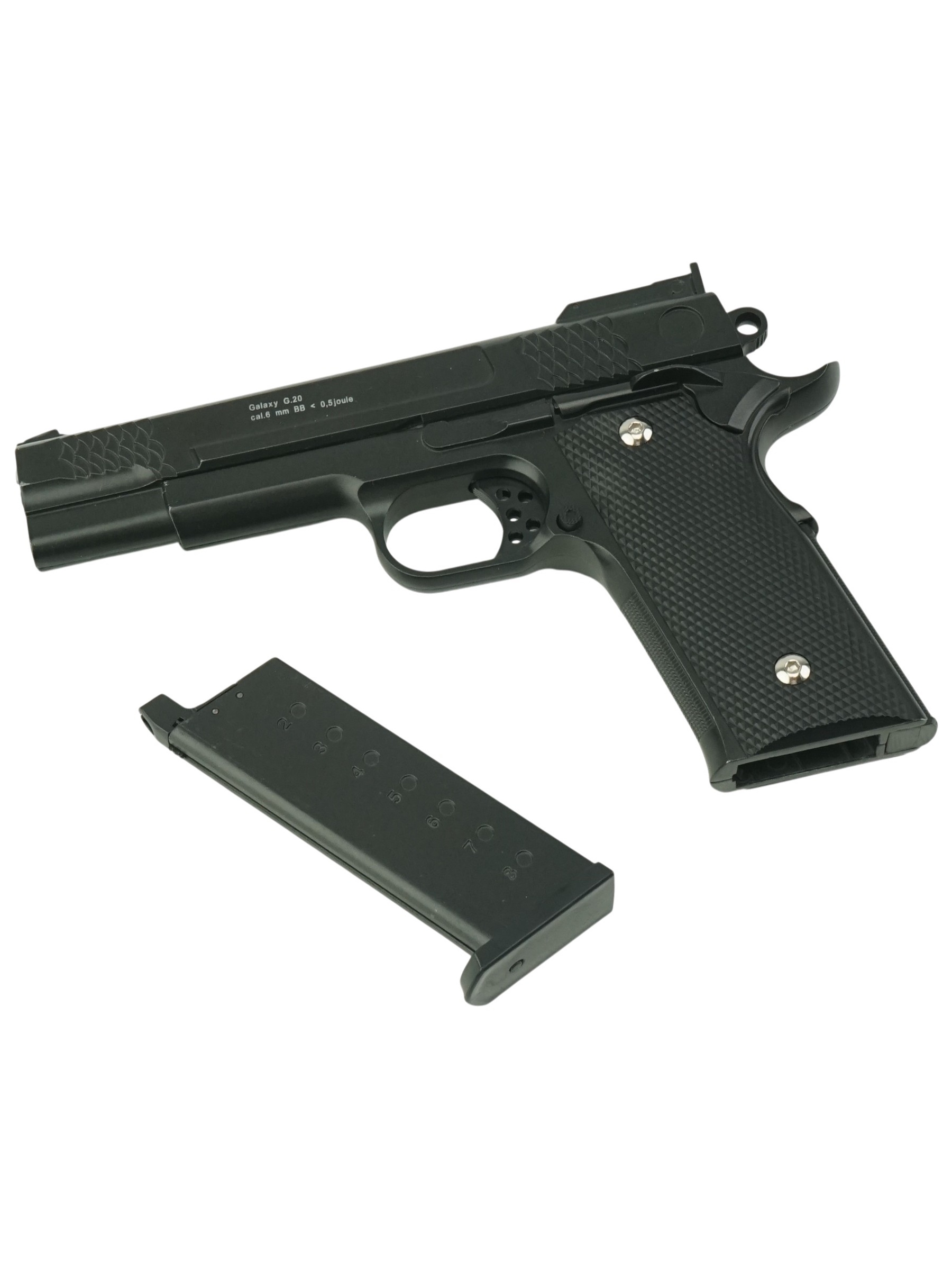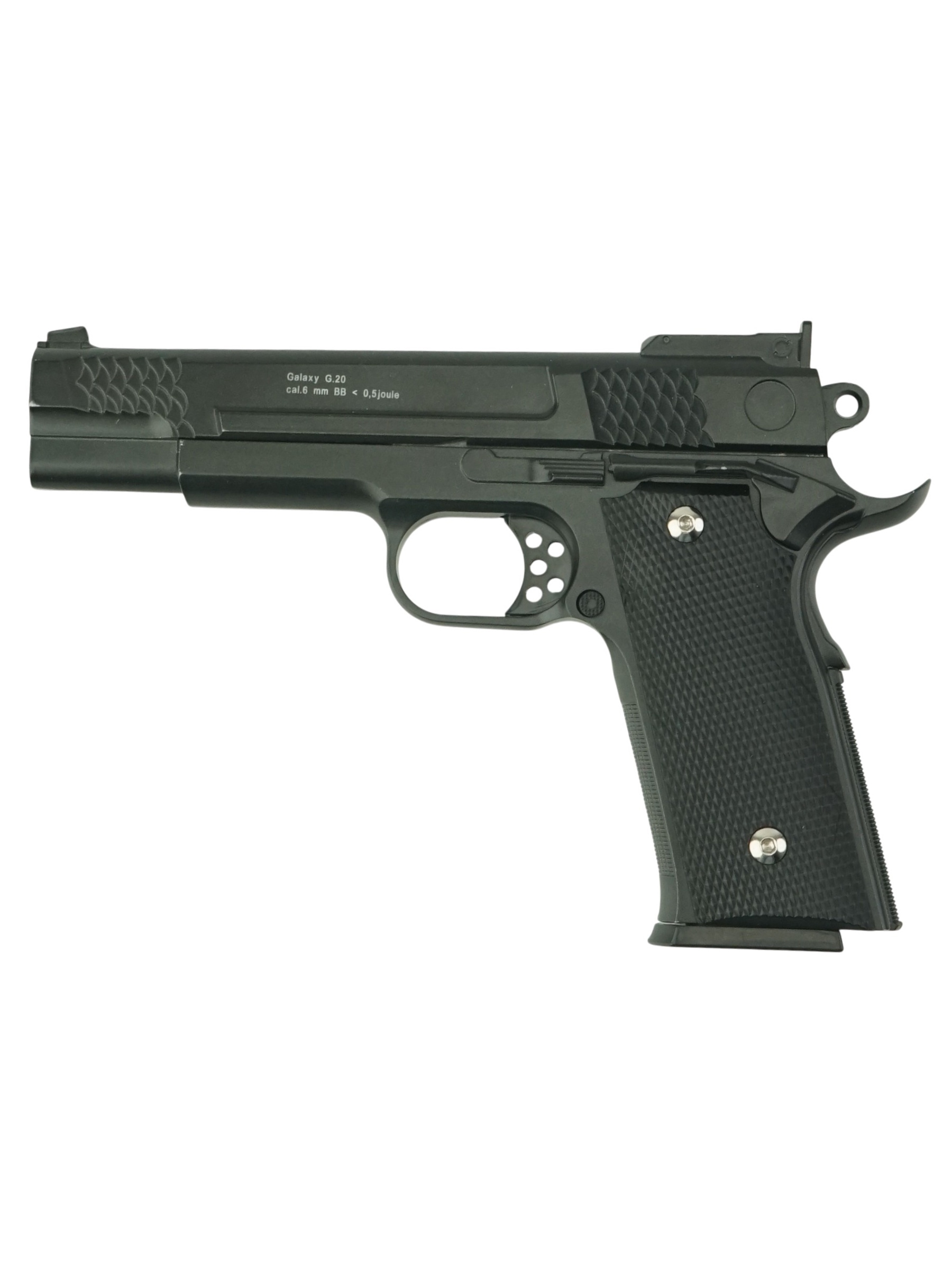 Galaxy G.20 - качественная спринговая страйкбольная модель классического пистолета Browning, изготовленная из качественного цинкового сплава и пластика. Начальная скорость выстрела шарика 80-89 метров в секунду.