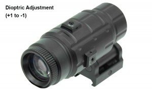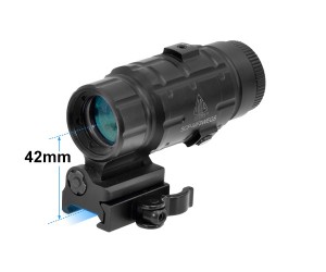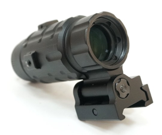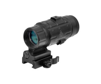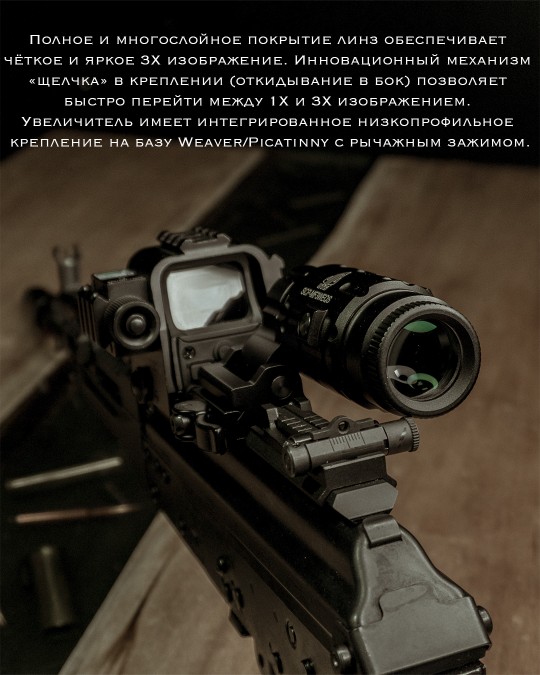 Полное и многослойное покрытие линз обеспечивает чёткое и яркое 3X изображение. Инновационный механизм «щелчка» в креплении (откидывание в бок) позволяет быстро перейти между 1X и 3X изображением. Увеличитель имеет интегрированное низкопрофильное крепление на базу Weaver/Piсatinny с рычажным зажимом.