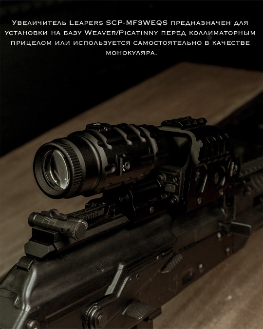 Увеличитель Leapers SCP-MF3WEQS предназначен для установки на базу Weaver/Piсatinny перед коллиматорным прицелом или используется самостоятельно в качестве монокуляра.