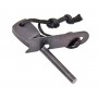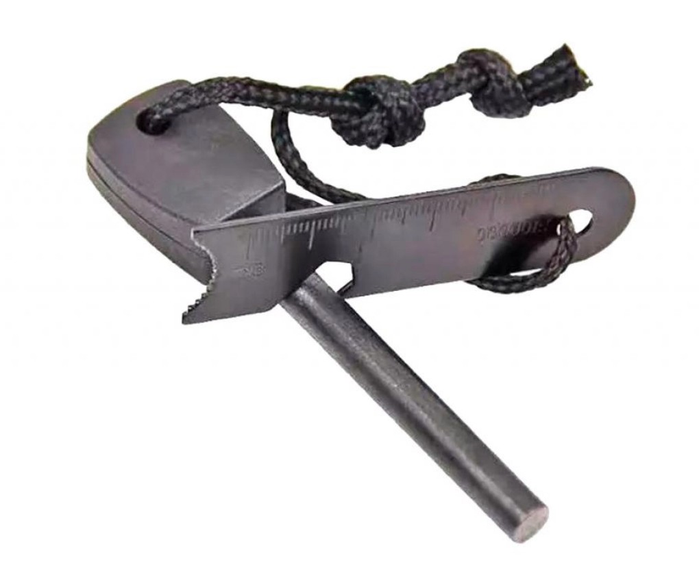 Помимо прямой функции высекания огня пластина используется еще и в качестве открывашки и линейки. Кресало и огниво закреплены на одном шнурке для удобства эксплуатации.