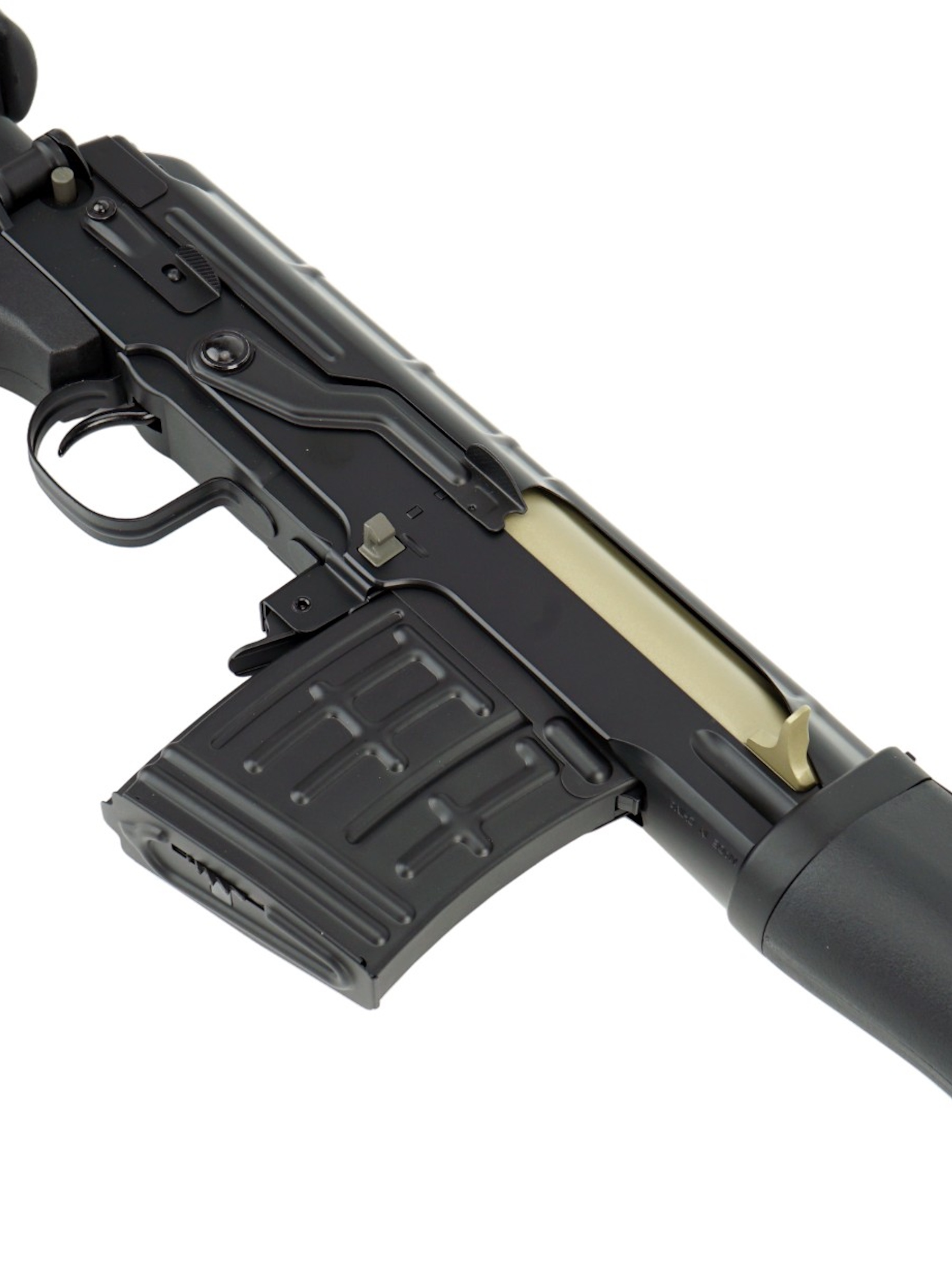 Главное достоинство винтовки Цима СВД АЕГ – качество изготовления и подгонки между собой всех деталей, а также высокая степень сходства с огнестрельным прототипом. Данная модификация выполнена в основном из ABS-пластика, часть компонентов изготовлены из сплава алюминия. Винтовка имеет штатные прицельные приспособления в виде регулируемого целика и мушки – по аналогии с боевой винтовкой Драгунова.