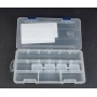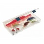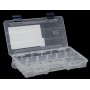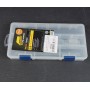 В органайзере находятся несколько отсеков, кол-во и размер которых могут изменяться благодаря наличию съемных перегородок (5-9 отсеков). Относительно небольшой размер органайзера позволяет переносить его в кармане рыболовной жилетки или куртки. А матово-прозрачный пластик позволит легко определить содержимое органайзера.