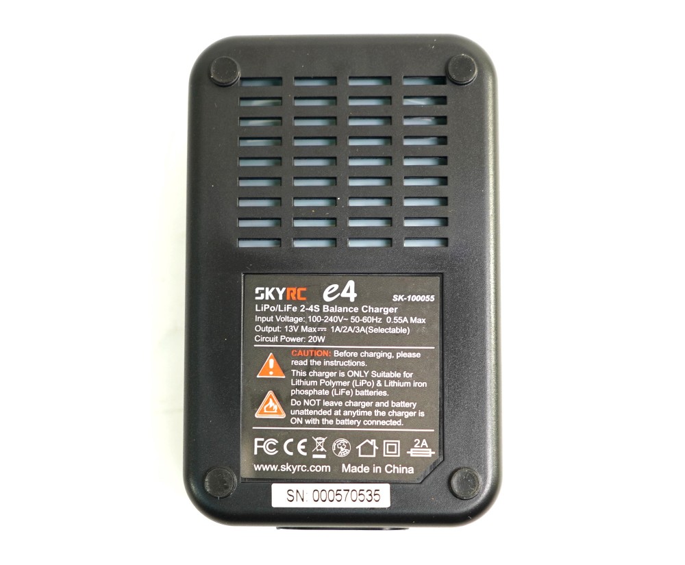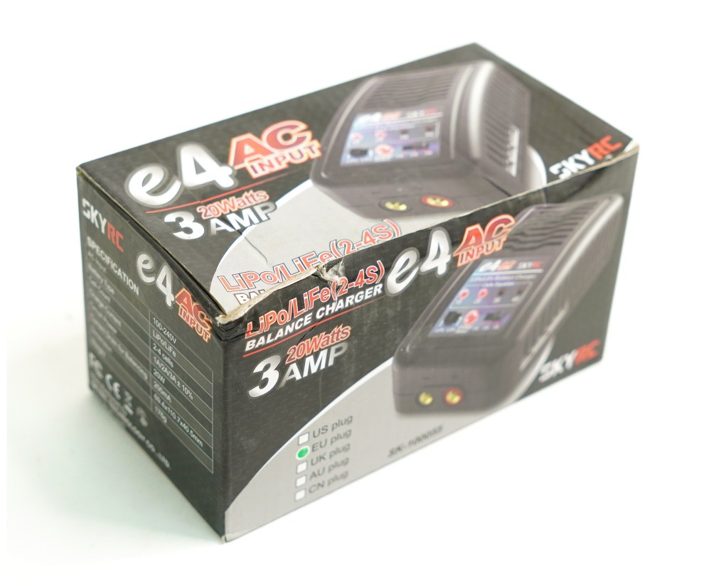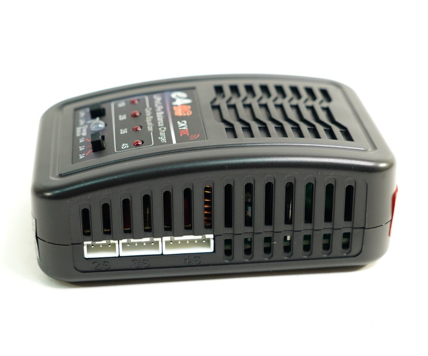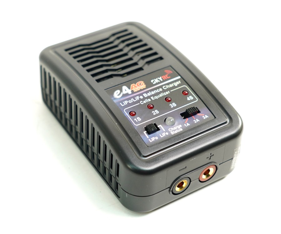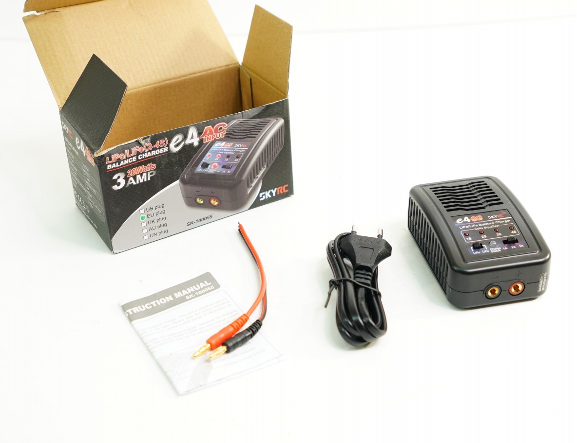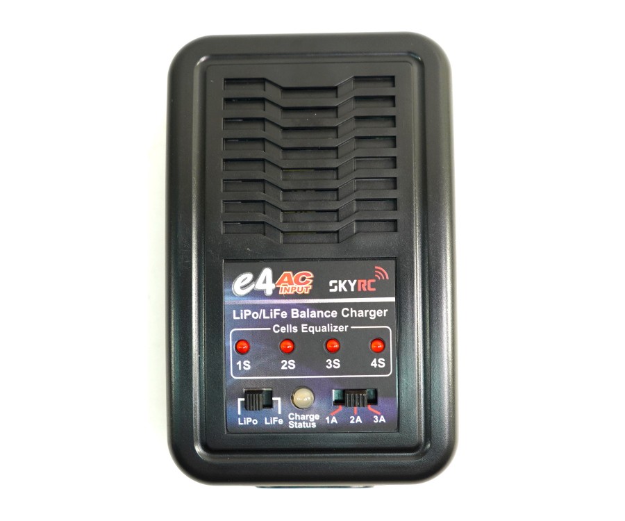 Зарядное устройство SkyRC E4 с током заряда до 3А (переключаемый ток заряда, А: 1/2/3) и балансиром для 2-4 баночных LiPo-LiFe аккумуляторов с разъемом JST XH, работает от сети 220В. Тип аккумулятора (LiPo-LiFe) выбирается переключателем.