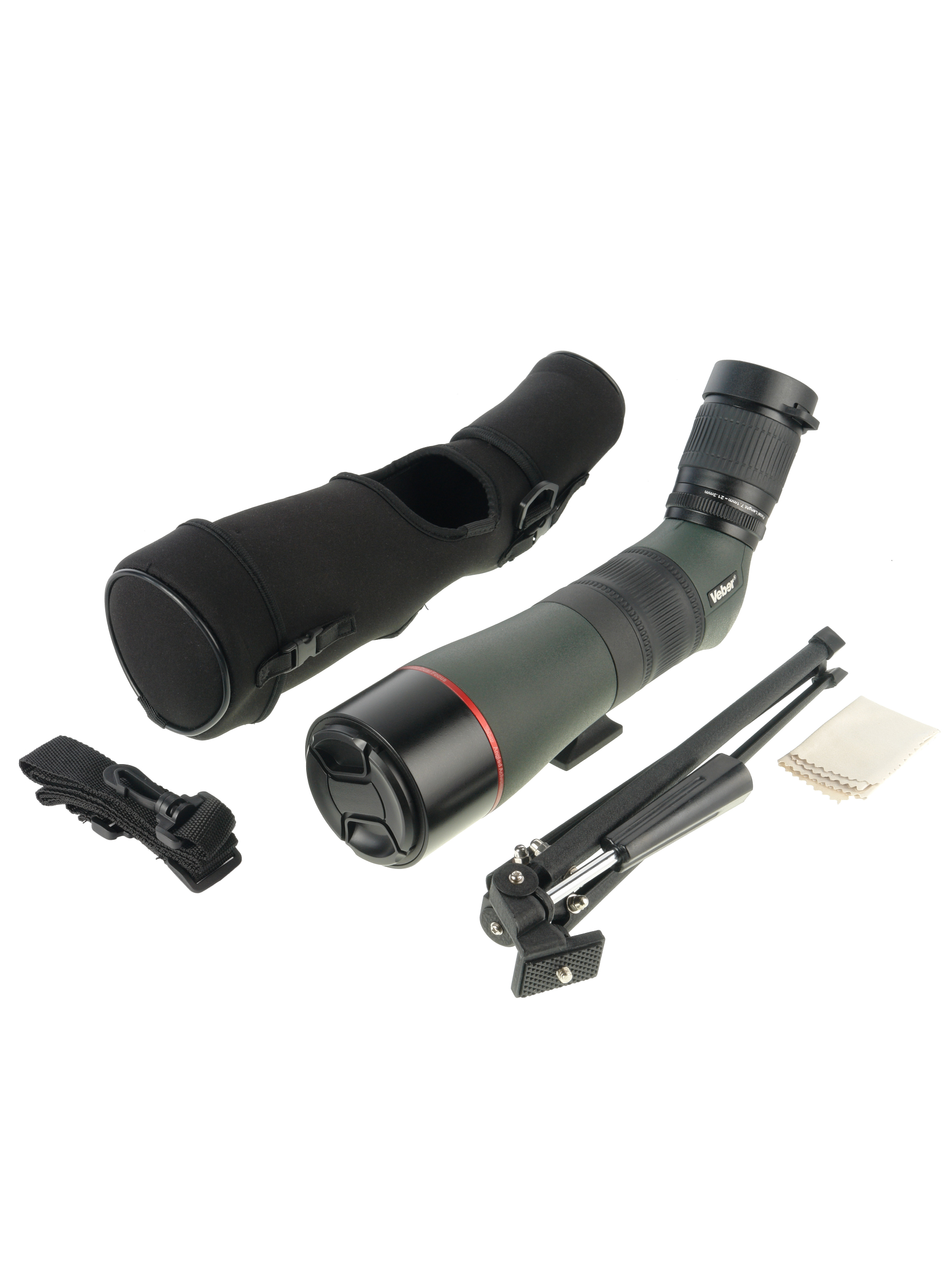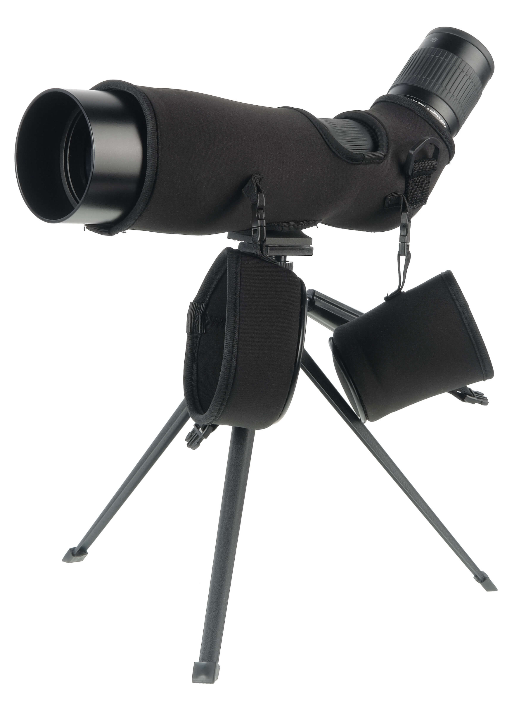 Неопреновый чехол со съемными крышками и наплечным ремнем выполняет не только защитную функцию, но и сохраняет тепло: трубой в чехле можно комфортно пользоваться даже при низкой температуре. Также зрительная труба снабжена выдвижной блендой для наблюдения при ярком солнечном свете и крышками окуляра и объектива – для защиты оптики от повреждений.