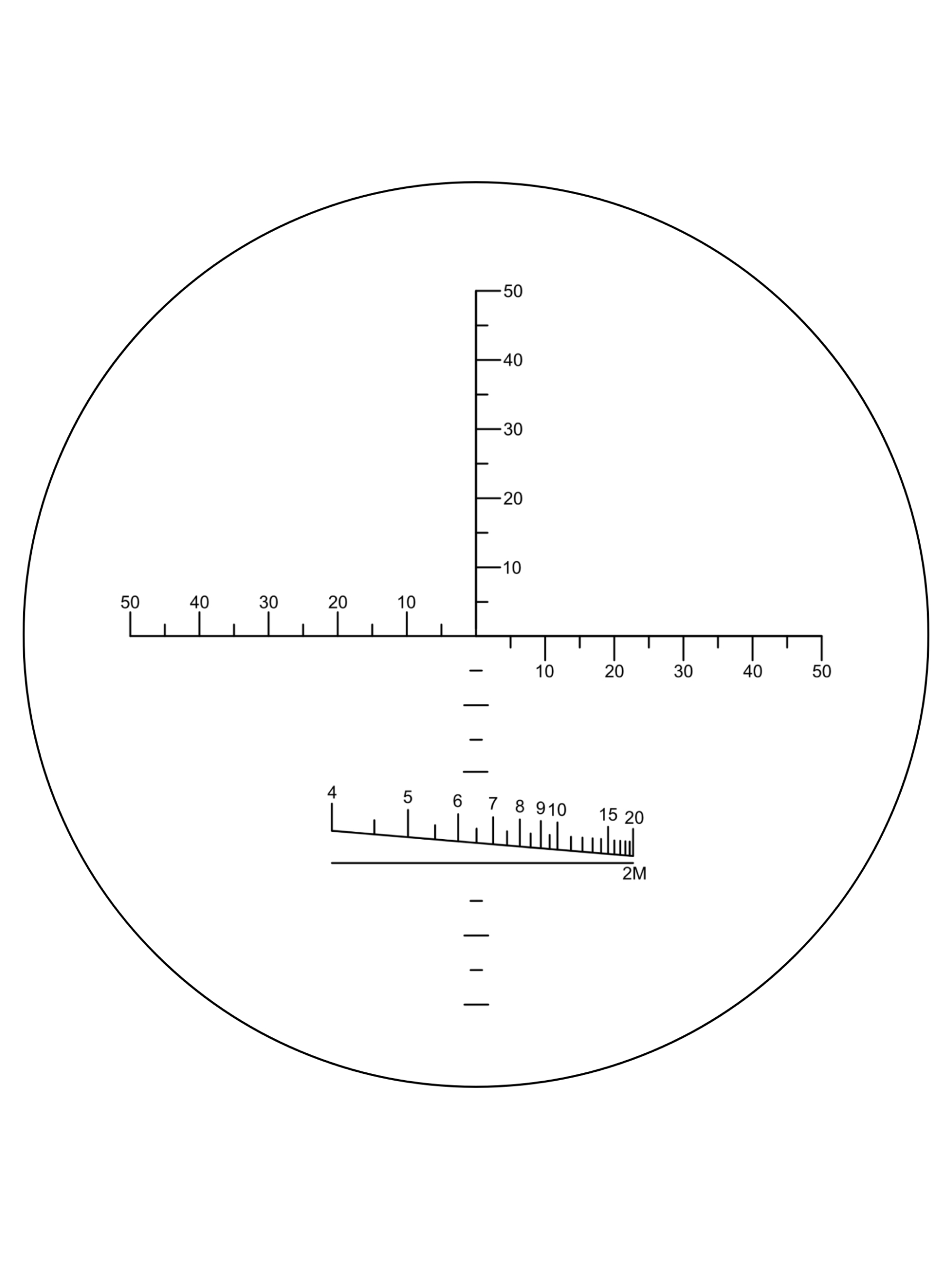 Тактическая измерительная сетка, расположенная во второй фокальной плоскости, видна в окуляре зрительной трубы и представляет собой комбинацию из угловой и дальномерной измерительных сеток.